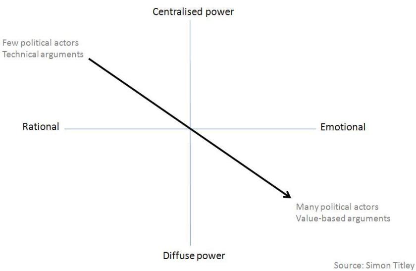 • In parallel, arguments used to gain political clout have developed from being highly rational (economic, scientific; easily measureable) to being emotional, or irrational even, often dictated by beliefs that are strong yet not so easily measureable, say, environmental protection.
