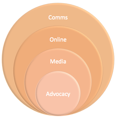 p.s. the web circle is not bigger than the media and advocacy circles because it’s more important, but because the web acts as the integrator that brings the rest together, beyond its own individual benefits as a channel. Whenever you engage in the media or through advocacy, it should be supported and channelled via the web also.